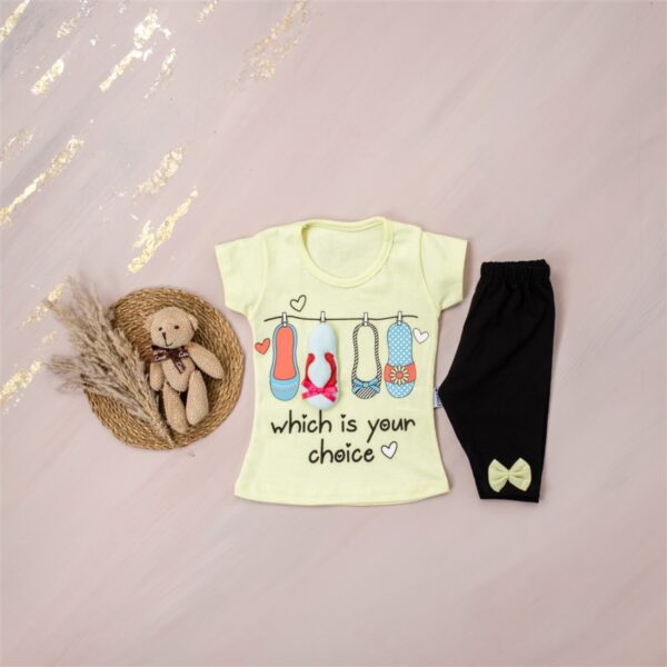 COMPLETINO BIMBA CON LEGGINS E MAGLIETTA A MANICHE CORTE CON STAMPA CON SCARPETTE IN RILIEVO.