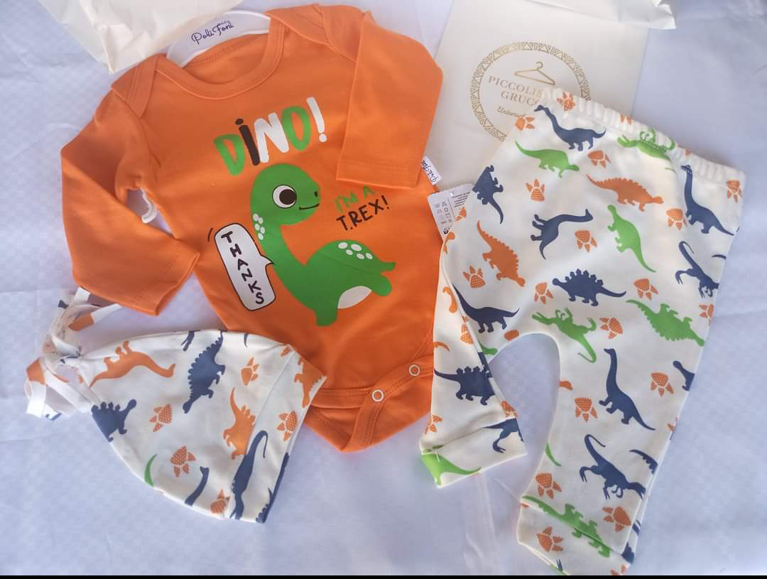 Il set comprende bodino manica lunga, pantalone con elastico in vita, e cappellino