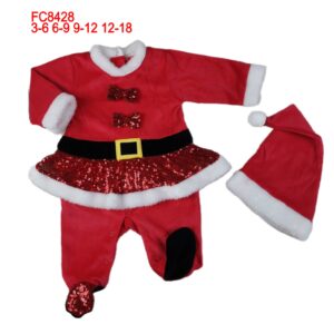 Tutina natalizia due pezzi, in ciniglia per neonata con cappello in coordinato.