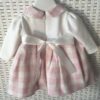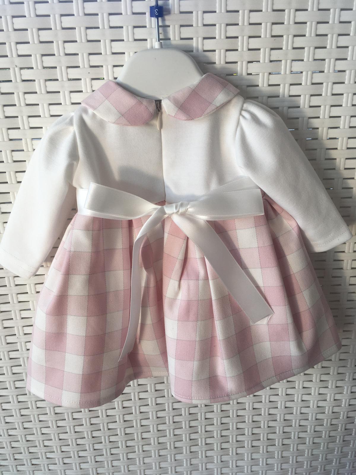 CIAO BIMBA, vestito neonata invernale con gonna plissettata e leggero strato di toulle in modo da dare volume al fondo, fiocco sul davanti con la stessa fantasia nei toni del rosa e del bianco che va a richiamare la gonna e il colletto, chiusura con cerniera lungo la schiena e nastro in raso da chiudere a fiocco.
